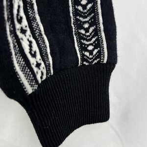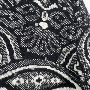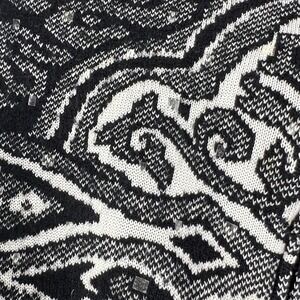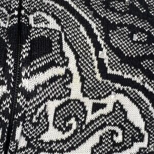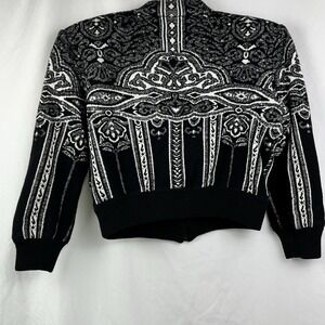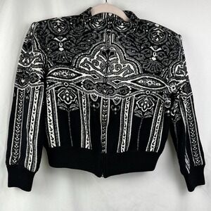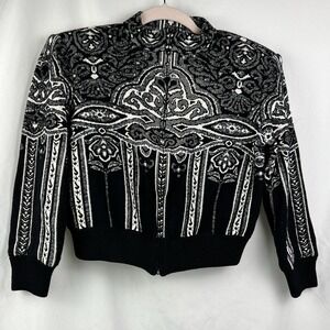 St. John Santana knit zip-up jacket/cardigan in black and white with an ornate, intricate pattern and a timeless, sophisticated silhouette. This piece embodies classic, elegant, and old-money aesthetics with a refined preppy chic feel. The monochrome palette and detailed knitwork evoke baroque-inspired elegance, making it ideal for polished business casual, formal layering, or elevated everyday wear. Features structured shoulder pads, ribbed cuffs and hem, and a high neckline. Women's size 6. Measurements: length approx. 18.5", pit-to-pit approx. 19". Pre-owned in good condition with light wear consistent with age. #OldMoneyStyle #PreppyChic #ElegantFashion #SantanaKnit #ClassicLuxury