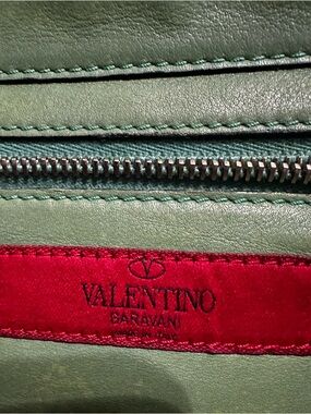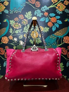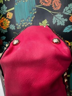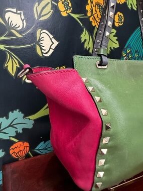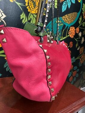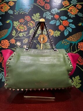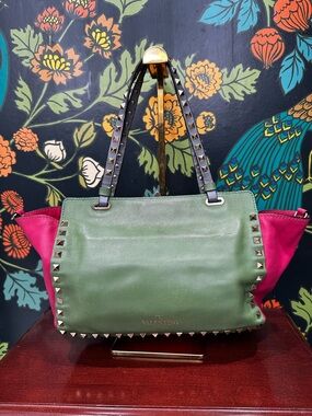 Authentic Valentino Garavani Rockstud trapeze tote in a bold tri-color design featuring vibrant fuchsia pink leather with a contrasting sage green back panel and gray studded straps. Crafted from supple calfskin and finished with signature platinum-tone pyramid Rockstud trim, this piece reflects Valentino’s iconic Rockstud era aesthetic. The structured trapeze silhouette features winged sides and a distinctive flip-lock closure, while D-rings allow for optional crossbody wear with an added strap (not included), offering versatile styling beyond a traditional tote. The interior is lined in canvas with a zip pocket and Valentino red label, made in Italy. In good pre-owned condition with light wear to the leather and some interior markings, this is a standout statement bag that blends bold color, edge, and everyday functionality.