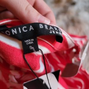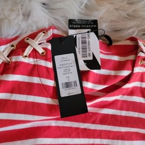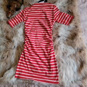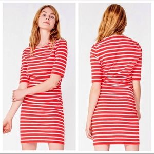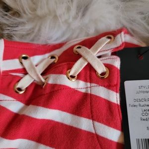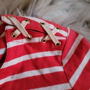 Veronica Beard "Foley" striped ruched dress with lace-up shoulders. Crew neckline. Three-quarter sleeves. Sheath silhouette. Hits approx at knee. Cotton. Imported.