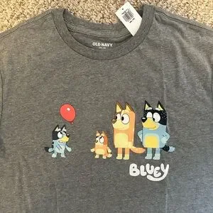 Gray t-shirt with colorful design of the Heeler family playing Keepy Uppy. Very soft and comfy. Size Kids XXL (18) but will comfortably fit a women’s medium. Brand new with tags. Just in time for Bluey’s Debut at Disneyland! See my other Bluey listings to bundle and make an offer!
