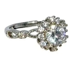 This adjustable silver ring features a 2.0-carat diamond simulate center stone with moissanite accents in a floral design.