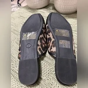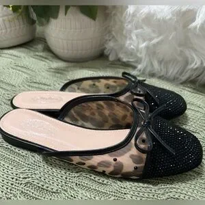 (117.) Snazzy slip-on mules with black rhinestone toe and leopard Atalina mesh sides. Comfortable faux-leather insole and easy slip-on design. Elegant black bow detail for a polished finish. Perfect for casual or dressy outfits in black and leopard tones.(NWOT)