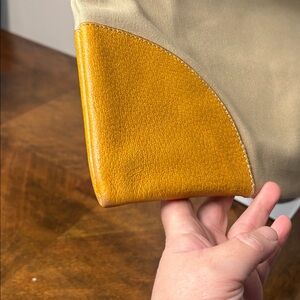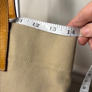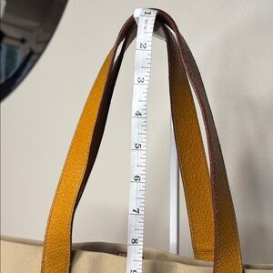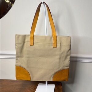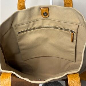 Stylish beige tote bag with tan leather accents. Perfect for everyday use.