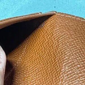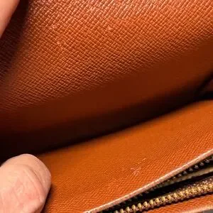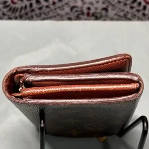 • Condition: Fair Used Condition. The exterior canvas is vibrant and the snap closure is firm. Please note significant wear shown in photos: Extensive peeling and "sticky pocket" residue inside the zippered coin compartment and bill slots, which is common for LV pieces of this era. There is also softening and rubbing at the side edges/folds and minor tarnishing on the gold-tone hardware.