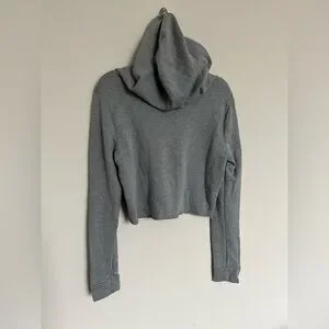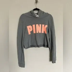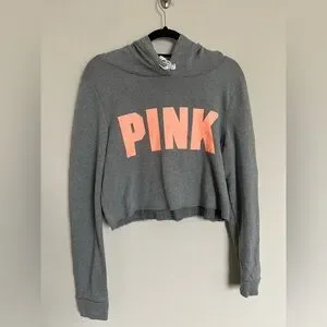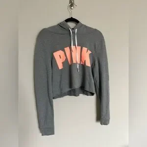 Super cute PINK by Victoria’s Secret cropped hoodie in a soft gray fabric with bold neon coral/pink logo across the front.