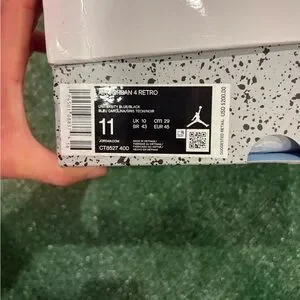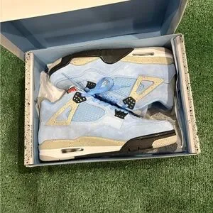 Classic Jordan 4 silhouette. Soft suede upper in light blue. Beige accents on midsole and eyelets. Black and gray detailing on sole and lace supports. Comfortable padded collar and supportive midsole.