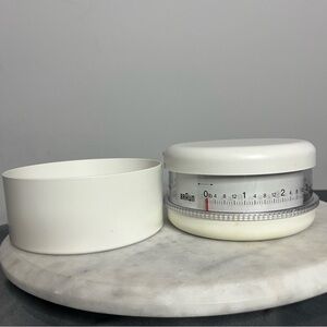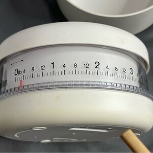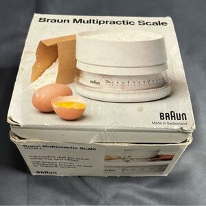 Braun Multipractic kitchen scale. Clean white plastic design with clear dial. Functional analog weight readout. Simple, classic look.