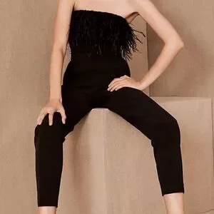 The sleek lines of this tailored jumpsuit gain a playful edge thanks to the floaty feathers that adorn its strapless bodice.