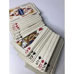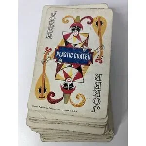 The product is a set of playing cards featuring a New Orleans scene with a horse-drawn carriage, published by Western Publishing Co. The brand responsible for the card set is Whitman. The cards are likely to have a Western or historical theme, with animal motifs likely to be included in the illustrations. Ideal for collectors or those interested in vintage playing card sets, this product offers a unique and nostalgic glimpse into a bygone era.