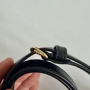 Sleek crescent silhouette in smooth black leather. Gold-tone Prada logo plaque and zipper. Single top handle for shoulder wear. Clean, minimalist design for versatile styling.