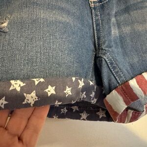 Lincoln blue denim shorts with subtle distressing and patriotic flag-printed cuff.