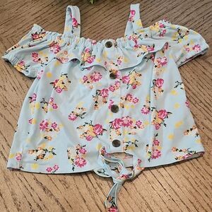 This charming off-shoulder kids top features a delightful floral pattern on a soft blue background. Perfect for sunny days, it combines style and comfort effortlessly 5T