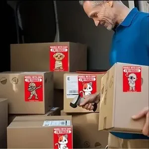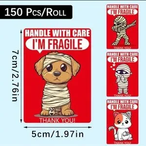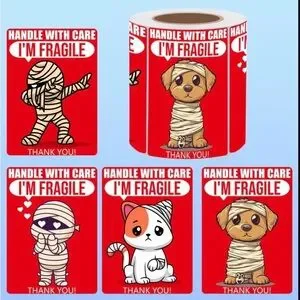 Add a giggle with the funny Fragile Stickers. The roll of 150 has four different designs of red stickers with 'Handle with Care' and 'I'm Fragile' and cute mummy cartoon characters.