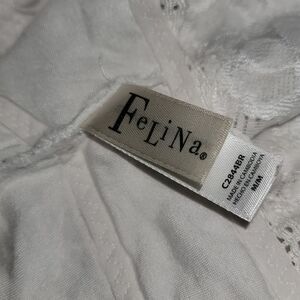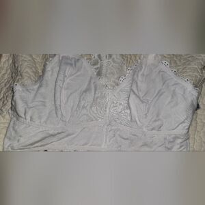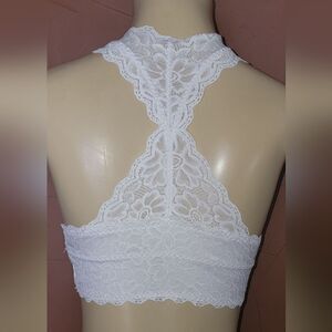 beautiful white lace bralette. good used condition. very stretchy, no underwire. lightly lined but not padded. wear it as lingerie or under a blazer or jacket for a night out! very hot.