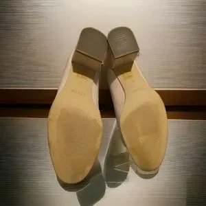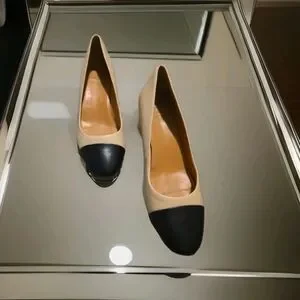 J.Crew women's leather block heel mid 2- 2.9 inches, heel pumps in a beige and black colorblock spectator style.