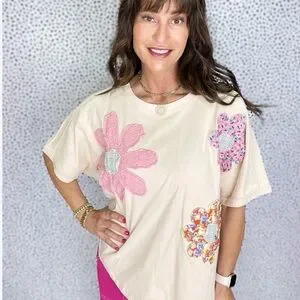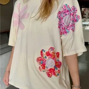 Cream short sleeve tee with large floral appliqués. Bright pink and multi-color flower patches add a playful touch. Relaxed fit and easy to pair with casual looks.