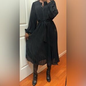 H&M Black Elegant Pleated Midi Dress with Waist Tie