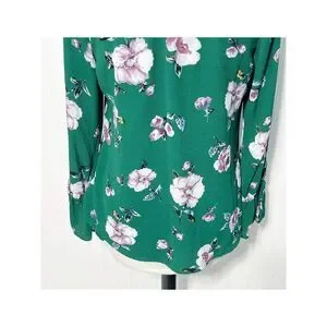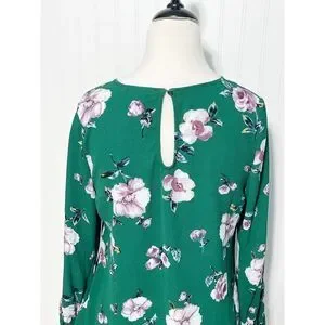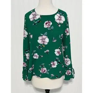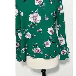 Live To Be Spoiled Floral Print Long Bell Sleeve Blouse Keyhole Back Green Large