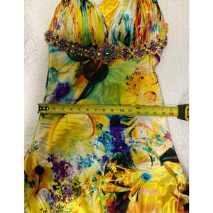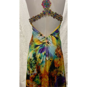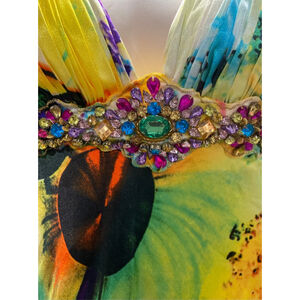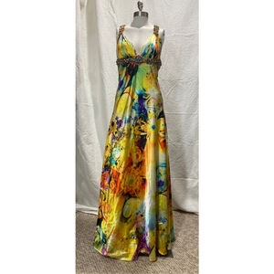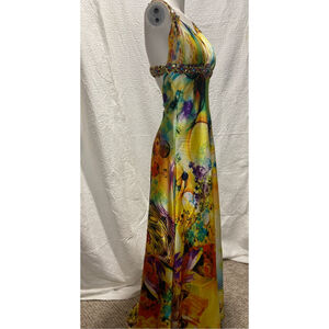 Vibrant multicolor Beaded floral gown V-neck empire waist, size XS