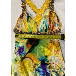 Stunning formal gown featuring a vibrant, watercolor-style floral print in hues of yellow, orange, turquoise, purple, and black. The dress is designed with an elegant V-neckline and heavily beaded spaghetti straps that form a stylish crisscross design in the back. The empire waist is beautifully accented with intricate rhinestone and bead embellishments, adding a touch of sparkle.