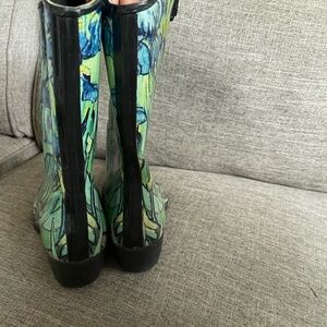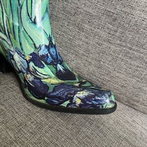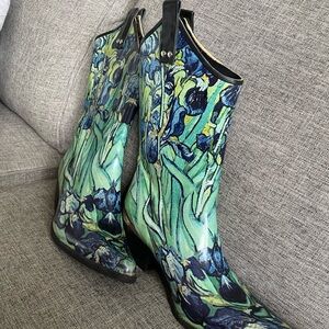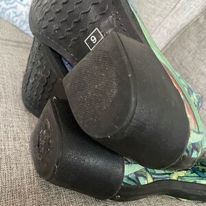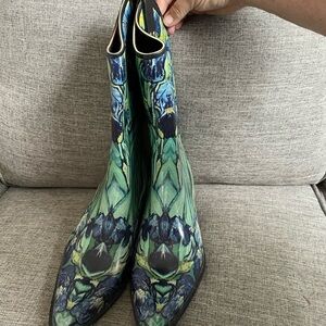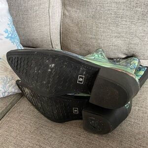 Nomad Green Floral Rubber western style pull on Rain boots w block heels sz 9