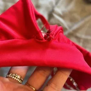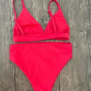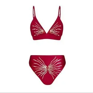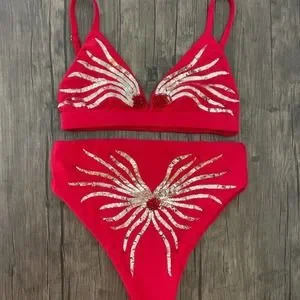 Tried on once and was too small. Top of the bikini will need repaired- see in the last few photos (price reflects). Ursula red bikini set from Oceanus. Gorgeous red and gold detail. Both top and bottom are a small. Originally $300.