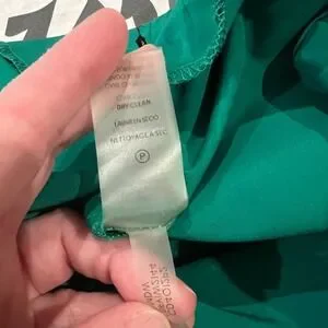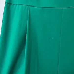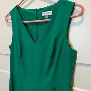 A chic Calvin Klein sleeveless V-neck wide leg jumpsuit in a vibrant green hue. This stylish piece offers a flattering silhouette with a comfortable wide-leg cut and a convenient zipper closure. Crafted from a blend of polyester and spandex, it provides both comfort and a polished look. A small loop is present at the waist, which may have been part of a belt or decorative detail. The jumpsuit is dry clean only.
