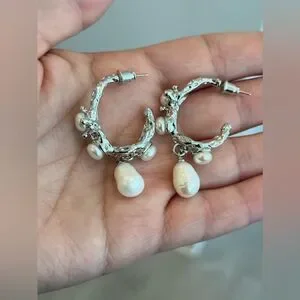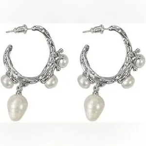 - **Design:** Silver-toned hoops with intricate branch detailing, accented by multiple freshwater pearls.