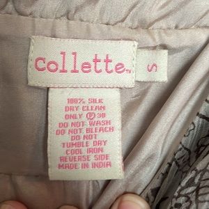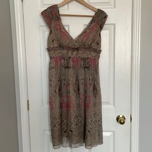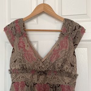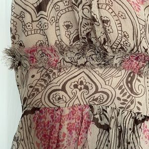 Romantic silk dress from Australian designer Collette Dinnigan’s Collette line. Cap sleeves, deep v-neck and empire waist with frayed detail. Beautiful flowy silk skirt and side zipper. Worn only once to a wedding.