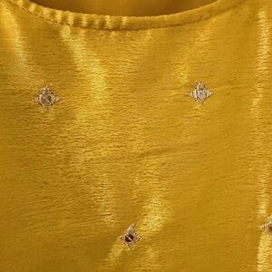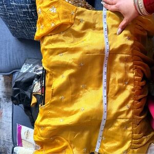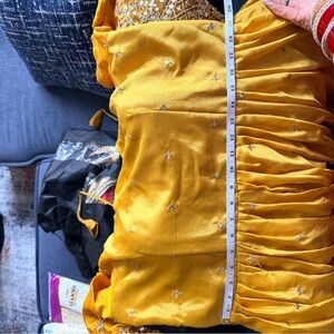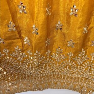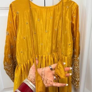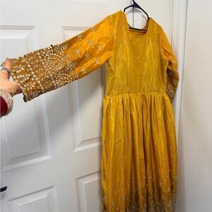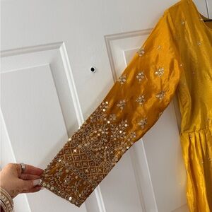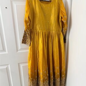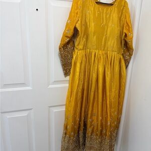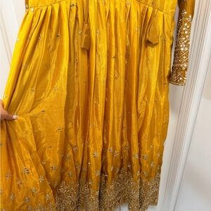 Elegant mustard yellow Anarkali dress with long sleeves. Intricate gold embroidery and sequin detailing. Matching mustard dupatta with gold border. Coordinating mustard churidar/pants included. Traditional festive style suitable for events.