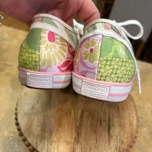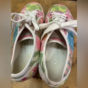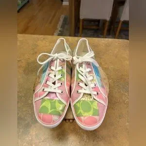 Vibrant sneakers with a mix of pink, green, and blue patterns. Features white laces and trim. WOW style and comfortable too! Size 9. Excellent used condition