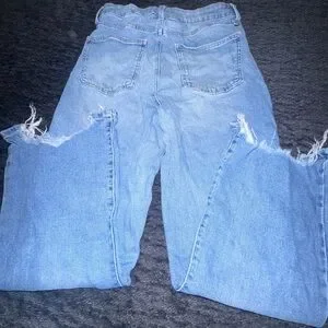 Stylish light blue jeans with a straight leg design. Features a trendy distressed look. Ideal for casual outings.