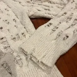 Keywords: ZARA cardigan, distressed sweater, ripped knit, V neck, button up, cream sweater, long sleeve, bohemian, edgy, festival wear, layering piece, casual chic, fashion knit