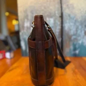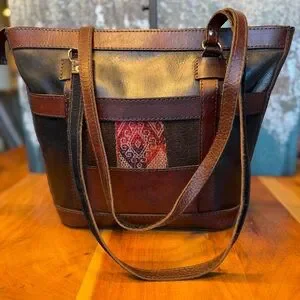 -Features a striking combination of deep chocolate brown leather and a traditional woven Andean textile insert.