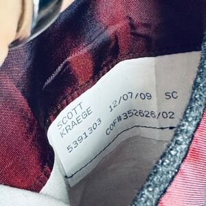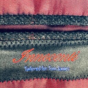 Classic men's wool blazer by Innocenti, tailored in the USA for Tom James with a refined plaid pattern in charcoal, grey and subtle burgundy tones. Features a two-button front, structured shoulders, notch lapel, long sleeves with buttoned cuffs, full lining in a rich red tone, and flap pockets with additional ticket pocket. Size 40R with a traditional silhouette; see measurements for precise fit. Quality craftsmanship, timeless menswear styling and premium wool fabric make this jacket ideal for business wear, fall layering or elevated everyday outfits. versatile plaid blazer tailored USA wool classic timeless style.