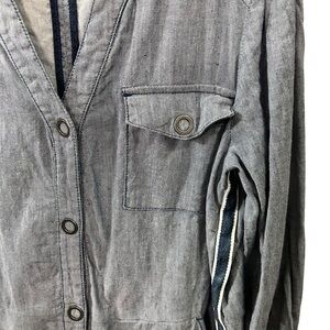 Features a full button placket with snaps, two side pockets, a chest pocket, and 3/4 sleeves with snaps at the cuffs.