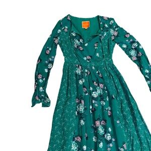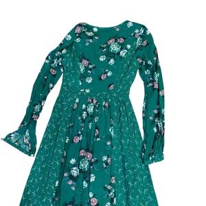 Green long sleeve floral printed maxi dress with tie at the neckline. EUC. Size XXS measures shoulder to hem 54”, armpit to armpit 16”, waist 11”