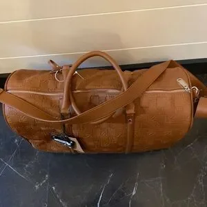This Steve Madden duffle bag is perfect for weekend getaways or travel. Made of faux leather with an embossed logo pattern, it has a zip closure and a shoulder strap handle. The bag measures 20 inches in width, 10 inches in height, and 14 inches in depth, making it a large size.