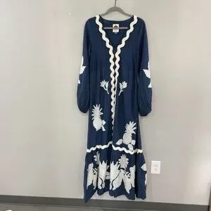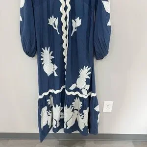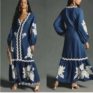 Farm Rio Dress Embroidered Flounce Maxi in Blue