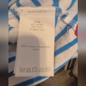 Color: Blue and white stripes on body; sleeves have contrasting stripes (blue at top)