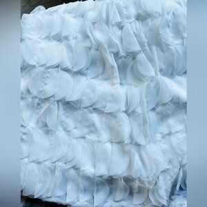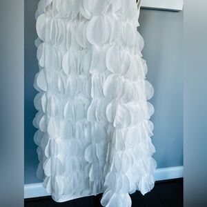 This fun shift dress features a fluttery chiffon fabric with layered, 3D-like circular appliqués, a solid chiffon yoke, and a hidden back zipper closure.
