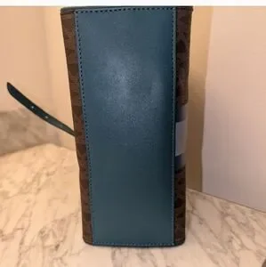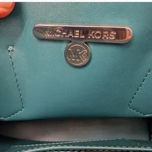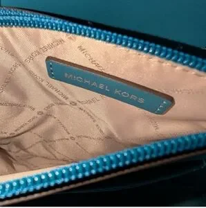 Michael Kors small leather satchel in brown with teal and light blue trim. The strap is detachable but the handles are static and not drops. This bag is in excellent used condition. Non-smoking home.