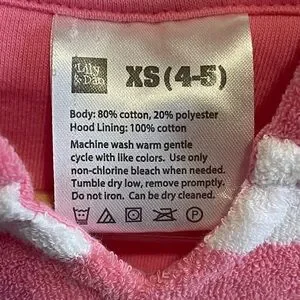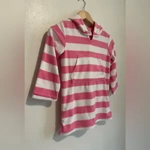 Lightweight hooded swim coverup in pink and white stripes. Soft, absorbent fabric for quick drying after swimming. Easy pullover design with a front kangaroo pocket for small essentials. Comfortable fit for everyday beach and pool use.