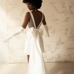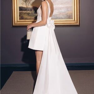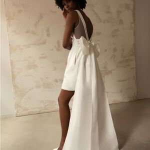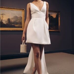 Elegant white mini dress by Jenny Yoo. Features a deep V-neck and a flowing train. Perfect for special occasions. Worn once & has been dry cleaned, in perfect condition!