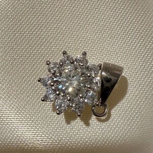 Flawless, never worn, 2 ct total weight Moissanite snowflake necklace pendant. The center stone is a 1ct round stone and the surrounding stones total 1ct. This has never been worn and is in perfect new condition.