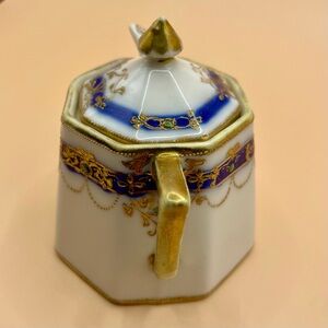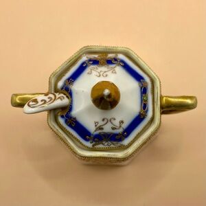 A rare and complete three-piece antique Japanese porcelain condiment set, including the hexagonal mustard pot, matching lid, and the original hand-painted porcelain spoon. This set was produced by the Morimura Brothers (later Noritake) during the "Nippon" era, specifically between 1906 and 1921.