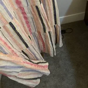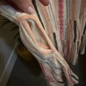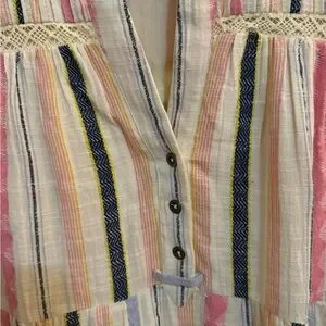 Tiered dress with vertical multicolor stripes. Button-front bodice and short sleeves. Lightweight textured fabric with relaxed silhouette. Easy, casual style for warm days. Cute lace trim at bodice and around back. Pockets! Colors are pink, peach, white, ecru and a periwinkle/denim blue. 37 inches from shoulder to hem. Super cute!!