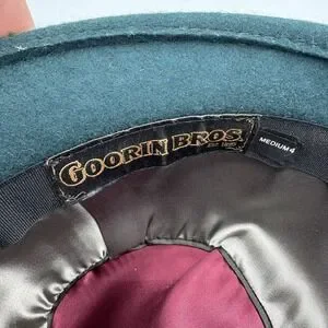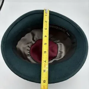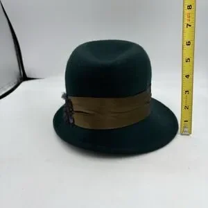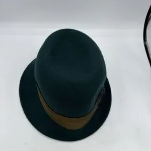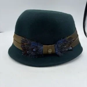 Pre owned used. Normal use wear. Color is dark green with a hint of blue or teal. The brim is designed shorter on side of feather compared to the opposite side. See pictures for conditions.