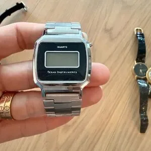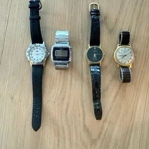 Lot of 4 Vintage men’s watches. Cannot confirm that any of them work. May need new batteries. 2 Timex watches, 1 very cool Texas Instrument watch, 1 Amitron. Some are in better condition than others.