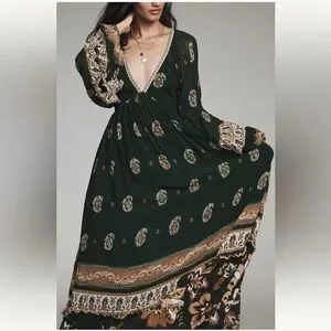 Flowing emerald green bohemian maxi dress with contrasting tan and cream floral print. Deep V-neck and billowy sleeves create a relaxed, feminine silhouette. Lightweight fabric drapes beautifully for easy wear. Perfect for day-to-night styling with boots or sandals.